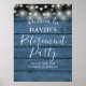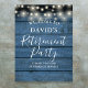 Com luzes de corda em um fundo de painéis de madeira rústica azul, este letreiro de boas-vindas para festa de aposentadoria elegante pode ser personalizado com as informações do seu evento especial. Criado por Thisisnotme©