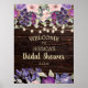 Bandeira / letreiro de boas-vindas para Chá de Noiva com design de madeira de celeiro rústico com luzes de corda e flores de aquarela rosa e roxo.