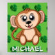 Este macaco fofo está sentado e esperando para brincar. Atrás dele há um fundo verde com um padrão de folhas da selva. Abaixo dele está o nome da sua criança, que está brincando na floresta tropical com ele. Adicione um companheiro fofo ao quarto ou berçário da sua criança.