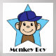 Arte de clipe de desenho com um macaco-animal feliz, sorridente, selvagem, numa estrela azul e vestindo um chapéu, ou boné de baseball em sua cabeça. O texto é o Macaco Boy.
