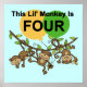 Três pequenos macacos balançando de uma árvore sobre T-shirts de aniversário dos macacos balançando, uniformes, canecas, cartões, totes, botões e outros itens para um tema de macaco 4º aniversário que o seu filho vai amar!