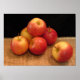 Esta poster apresenta uma composição muito simples, ainda viva, de seis lindas maçãs vermelhas e amarelas brilhantes em um tapete de palha contra fundo preto.