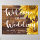Madeiras Rústicas, Girassol Amarelo Bem-vindo ao nosso Poster de Casamento. Uma forma excelente de dar as boas-vindas aos convidados do casamento. Este rustic Welcome to Our Wedding poster tem um fundo de madeira rústico com girassóis amarelos brilhantes e WELCOME TO OUR WEDDING escrito em negrito letra de texto. Personalize o poster mudando os nomes da noiva e do noivo e a data do casamento. Para mais personalizações, contacte-me em mypaperlove2021@gmail.com