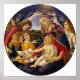 Madonna do Magnificat de Sandro Botticelli, 1483, é uma pintura circular tempera sobre madeira da Madonna com o Cristo Child em seu colo segurando um livro de música do Magnificat, a canção de Maria. Ao redor deles está um grupo de jovens que se assemelha a anjos, segurando quase uma ouro coroa radiando luz. O formato redondo da imagem é conhecido como tondo, formato usado em algumas pinturas religiosas renascentistas. As robes azuis harmoniosas e a abertura de uma paisagem italiana legal dão a impressão de uma cena de outro mundo, como se pintada em uma esfera. Sandro Botticelli (1445-1510) foi pintor florentino do início da Renascença italiana que se formou sob o mestre Filippo Lippi. Com fortes influências góticas, a madura obra de Botticelli refletiu um estudo de escultura clássica antiga e foi notada por sua graça e ritmo lineares, formas achatadas como alivios com contornos fortes e sutis coloração. A complexidade dos significados nas composições de Botticelli, a partir de fontes extraídas da Antiguidade clássica, mitologia e filosofia, enfeitiçou estudiosos durante séculos.
