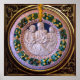 Elegante clássico, vibrante Renascentista arte fina, obra-prima de Bottega della Robbia ( Florence - Itália ) em cores brancas, azuis, verdes, castanhas.Uma cena de natividade antiga, estável, animais, árvores, cerejas aladas no céu azul sobre uma coroa floral decorativa verde e amarela brilhante.