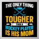 Poster do tema de hóquei para a mãe de hóquei com paus de hóquei e paus com texto de branco, amarelo e azul que lê A única coisa mais forte que um jogador de hóquei é sua mãe!