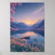 Contemplem a beleza da natureza com este trabalho de arte digital espantoso. Um belo lago de montanha fica no centro, cercado por flores cor-de-rosa no primeiro plano. À distância, montanhas majestosas se erguem, com o sol se pondo atrás delas. Esta peça captura a essência da beleza da natureza e cria um sentido de calma e tranquilidade. Traga a majestade do excelente ao ar livre para o seu espaço com esta bela trabalho de arte.