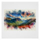 Vivid colors showcase a mountainous landscape under a dramatic sky. Forests and valleys are depicted with splashes of color for a dynamic effect. Gros Morne is a National Park in Canada. "Soaring fjords and moody mountains tower above a diverse landscape of beaches and bogs, forests and barren cliffs. The national park was shaped by colliding continents and grinding glaciers."