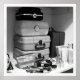 Este impressão de fotografia preto e branco apresenta uma coleção de pincéis cosméticos, loções, capas e garrafas de perfume.