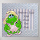 O sapo da mamãe está deixando todos saberem as regras do banheiro dela. Fundo azul claro com letras pretas.