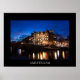 Na moda poster impressão das antigas casas românticas da cidade de Amsterdã, construídas ao longo do canal de Prinsengracht, com reflexo das luzes na água tranquila no início da noite na capital da Holanda com uma fronteira negra e o texto "Amsterdã". Excelente decoração de verão na sua parede!