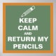 Seus alunos pedem lápis emprestados e nunca os devolvem? Lembre seus alunos de devolver seus lápis colocando este poster na sua sala de aula. Este poster exibe uma imagem de um quadro com o texto "MANTER CALMA E RETORNAR MEUS PENCILS" em uma fonte branca.