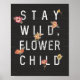 Espalhe algumas boas vibrações com esta mensagem positiva poster que diz, "Fique Selvagem, Criança Flor" em um estilo angustiado. A inscrição branca é acentuada por ilustrações florais coloridas e destaca-se bem contra o fundo de tijolos coloridos.