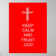 Inspirada pelo poster da Segunda Guerra Mundial Britânica, "Mantenha Calma e carregar", esta design apresenta uma cruz branca e o texto, "Mantenha Calma e Confie em Deus."