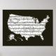Mapa musical preto-e-branco dos EUA. Um design gráfico do continente americano com notas musicais