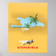 Mapa de Hispaniola, praia arenosa e palmeiras da ilha Caribe.