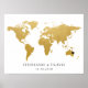 Mapa mundial dourado e nomes personalizados ou qualquer texto e marcador de coração é lindo como obra de arte para um casal aventureiro ou usar como livro de visitas alternativo para casamentos com tema de viagem, eventos de destino, celebrações de bar mitzvah e bat mitzvah com tema de viagem e chás de bebê ou de noiva.