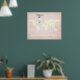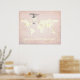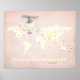 Arte de berçário rosa, creme e ouro falso com mapa mundial, citação inspiradora de aventura de Amelia Aerhart e balão de ar quente vintage.