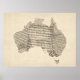 Um mapa da Austrália feito a partir de uma colagem de músicas antigas e antigas, incluindo algumas notas e pontuações escritas à mão, sobre um fundo antigo.