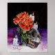 Eu queria pintar algo com sentimentos de outubro. Começou com uma simples vida estática de alguns marigóis do pátio e evoluiu para isto...pintura mais complicada. O pensamento era sobre as memórias de animais de estimação que perdemos, e o que uma bruxa se familiariza pode significar para ela, mesmo depois de terem falecido. As pessoas muitas vezes interpretam mal as coisas, levando-as à primeira vista e não considerando o significado mais profundo...podem olhar para isto e pensar e mau sacrificar um animal...Mas esta arte é sobre honrar os espíritos de gatinhos amados que passaram por aquela ponte do arco-íris de uma forma natural, e o fogo de suas memórias que vivem em nós ainda ao redor. Os meios usados: aquarela, goche, canetas finas e um lápis prismacolor de ouro
