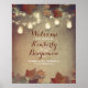 Folhas da árvore de mapeamentos, luzes de cordas, jarras de pedras, casamento outono de arromba rústica Sinal de boas-vindas