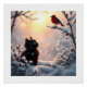 Uma paisagem serena de inverno com um pequeno gatinho preto e um vibrante pinto vermelho contra um pano de fundo de folhagem gelada e flocos de neve suavemente caindo, evocando um senso de magia e maravilha em um estilo cinemático e épico que lembra pinturas clássicas de matte e arte digital atmosférica.
