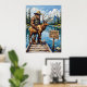 Este trabalho de arte imaginativo retrata o Pé Grande, um gigante gentil em um chapéu de vaqueiro e colete, parado em uma doca de madeira por um lago tranquilo. Ele está cuidadosamente carregando um alce jovem. O fundo apresenta árvores verdes e montanhas nebulosas sob um céu macio. Um letreiro de madeira metida na doca diz brincalhão, "BIGFOT TAMBÉM NÃO ACREDITA EM VOCÊ". A escova grossa e expressiva cria uma qualidade sonhadora, enfatizando a delicadeza e um pouco surreal desse momento lacrado.