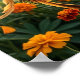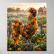A proud marigold rooster stands tall in a lively farm garden where rustic spirit meets floral brilliance. Realistic rooster anatomy blends with marigold petals, warm foliage, sweeping tail feathers, and layered botanical textures across the chest, wings, crest, and tail. Wooden fences, flower beds, distant barns, golden sunrise light, and soft mist create a cheerful countryside scene rich with charm. This bold fantasy farmhouse design adds warmth to kitchens, dining rooms, cottages, or gift collections. Perfect for rooster lovers, country decor fans, and harvest styling.