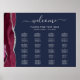 A borda esquerda deste elegante e moderno quadro de assentos de casamento apresenta uma cor d'água borrifada com borda cortada com falso brilho prateado. A palavra "bem-vindo" aparece no topo em uma elegante escrita manual de cinzas prateada com baloiços no início e no fim. Personalize com os nomes da noiva e noiva e a data do casamento em itálico. Edite as quatro colunas com uma lista dos nomes de seus convidados e números de tabela na fonte da placa comercial da cinza prateada em um fundo azul marinho. Acomoda até 100 nomes.