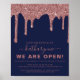 Marinho Chic Blue Rosa Dourado Sparkle Glitter Drips O Poster de Sinal de Abertura de Negócios com nossas tendências de brilho inverso pia-rosa/rosa ouro e seu nome, nome comercial ou logotipo. Perfeito para anunciar sua abertura, reabertura, ou apenas para mostrar sua estética de luxo. Você está pingando no luxo, então seu equipamento deveria estar também! Entre em contato conosco em cedarandstring@gmail.com se precisar de assistência com o design ou produtos correspondentes.