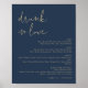 Este cartaz de menu de bebida de casamento "bebado no amor" impresso apresenta um design moderno minimalista e uma combinação de cor azul e dourada marinho. Altere facilmente a fonte e a cor de fundo para corresponder ao seu evento. Isto é perfeito para um casamento, chá, chá de panela, festa de noivado ou qualquer outro evento especial.