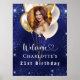 Um poster de boas-vindas para uma festa de aniversário de 21 ruas (ou qualquer idade) entre giros e glamourosos. Um fundo azul marinho com faíscas elegantes e balões ouros. A cor azul é irregular. Personalize e adicione um nome, idade. Adicione uma foto ao quadro do balão. Cartas brancas. Bem-vindos com o coração.