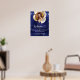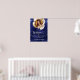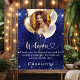Uma poster de boas-vindas para uma festa de aniversário. Um fundo azul marinho com faíscas elegantes e balões ouros. A cor azul é irregular. Personalizar e adicionar um nome, texto de boas-vindas da idade. Adicione uma foto ao quadro do balão. Cartas brancas. Bem-vindos com o coração.