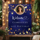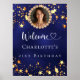 Um poster de boas-vindas para uma festa de aniversário de 21 ruas (ou qualquer idade) entre giros e glamourosos. Um fundo azul-marinho incolor decorado com estrelas douradas sujas. Personalize e adicione um nome e idade 21. Bem-vindos com o coração. Adicione a sua dentro de fotografia à estrutura falsa de diamante.
