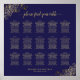 Este gráfico de assentos de casamento inclui atribuições de mesa para 150 convidados em 15 mesas. O design é simples, mas elegante, com texto dourado sobre fundo azul marinho. O título está escrito em uma caligrafia de escrita falada e há decorações florais frias de folha falsa nos cantos. Na moda, chic e sofisticada maneira de ajudar seus convidados a encontrar seus assentos na sua recepção.