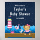 Esta bela e divertida placa de boas-vindas apresenta um macaco-marinheiro náutico num convés de madeira com uma gaivota e um caranguejo. Ao fundo há um farol rosa e branco, um pássaro giro em um veleiro, ondas oceânicas e um marinho azul estrelado céu noturno. O texto combina fontes em negrito e sem serifa para uma aparência na moda e moderna. Isto é perfeito para um chá de fraldas temático náutico.