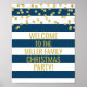 Texto personalizado bem-vindo à placa da festa de Natal com padrão moderno de listras azuis e brancas e confete de ouro festivo.