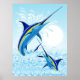 Ilustração realista de um belo animal marinho Marlin Azul saltando do oceano. Arte vetorial com direitos autorais BluedarkArt TheChameleonArt.