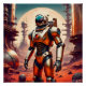 Um astronauta solitário está sobre uma paisagem de alienígena rochosa, mirando em uma enorme estrutura robótica com uma cúpula clara e pernas mecânicas. Vários planetas são visíveis no céu, criando uma cena marcante de exploração espacial.