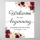 Use nosso sinal de marsala, burgundy e vinho floral "Bem-vindo ao nosso Começo" para dar as boas vindas aos seus convidados à cerimônia de casamento ou à recepção. O texto é personalizável. Use a ferramenta "Personalizar este modelo" do Zazzle para inserir suas próprias informações. Se você precisar alterar o posicionamento das caixas de texto, a cor ou o tamanho da fonte, basta clicar no botão "Clique para personalizar mais" para alterar essas coisas. Certifique-se de verificar nossa grande seleção de itens coordenadores navegando na coleção de Casamento Floral de Marsala!