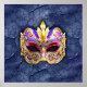 Uma máscara colorida e ornamentado com detalhes dourados, roxos e cor-de-rosa se destaca em relação a um fundo azul escuro e texturizado. A máscara apresenta padrões intrincados e espirais decorativos, dando-lhe uma aparência luxuosa e festiva.