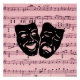 O talento artístico vem em muitas formas e quando se unem é espetacular. As máscaras de comédia e tragédia no teatro grego estão sobre uma folha de música.