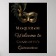 Welcome your guests in style with this glamorous black and gold masquerade welcome sign. Featuring a luxurious gold mask, this design sets the perfect tone for an elegant birthday celebration.