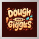 Um design brilhante e divertido que apresenta o texto "Dough and Giggles" em uma fonte cartoonesa com cores brilhantes e lúcidas. A composição geral é animada e convidativa, evocando um sentimento de alegria e riso.