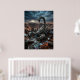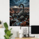 A dramatic alien desert crater reveals the remains of a colossal mechanical structure emerging from crimson sands and fractured rock. The scorpion-like form appears ancient and monumental, integrated into the landscape as a forgotten relic. Reflective surfaces, acid-washed terrain, and storm-lit skies create a powerful cinematic mood. Subtle neon highlights shimmer across metallic textures, adding depth and contrast to the dystopian environment. This artwork blends industrial design with sci-fi storytelling, making it a bold statement piece for modern interiors inspired by futuristic ruins and atmospheric worlds.