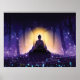 Buda meditando debaixo de uma árvore com um fundo roxo e brilhante.
