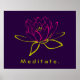 Medita escrita debaixo de um contorno de uma flor de lótus. Pétalas esboçadas em rosa e folhas esboçadas em verde.