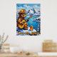 Este charmoso trabalho de arte apresenta um urso vestido de bombeiro, completo com um capacete e óculos de sol, tocando um violão acústico enquanto sentado num pico coberto de neve. Um pote de mel senta-se ao seu lado. O fundo mostra um lago azul sereno, montanhas com capa de neve e árvores verdes sob um céu parcialmente nublado. A pintura usa pinceladas grossas, texturizadas, dando uma sensação caprichosa e entusiasmante, com "Love My Honey" escrito abaixo.