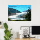 Uma pintura digital de Mendenhall Glacier, perto de Juneau, no Alasca. Icebergs flutuam no lago de água derretida na face da geleira. Leitura personalizável de texto, "Glaciar Mendenhall" também é exibido.