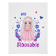 Menina bonita com cabelos loiros, vestido cor-de-rosa, flores em fundo branco e texto MISS ADORABLE